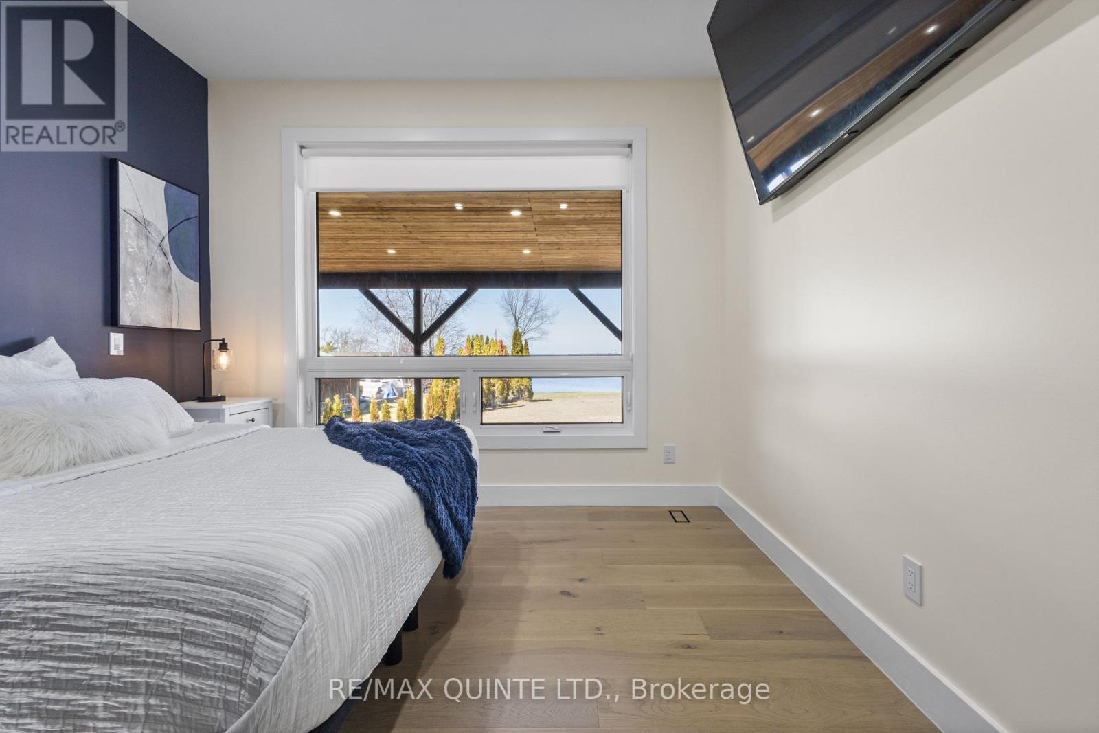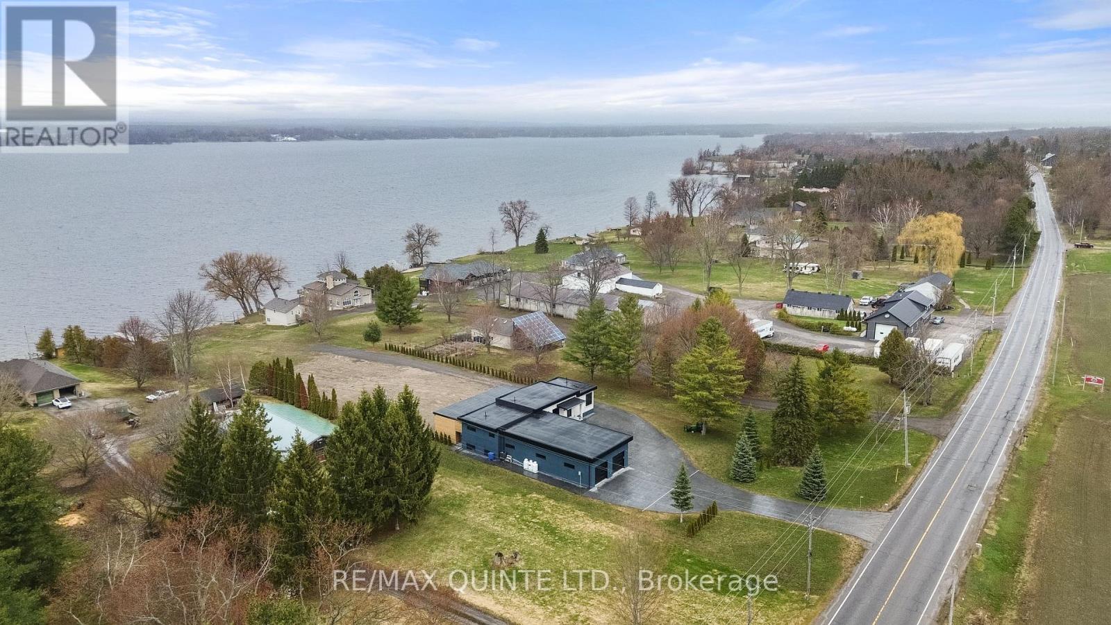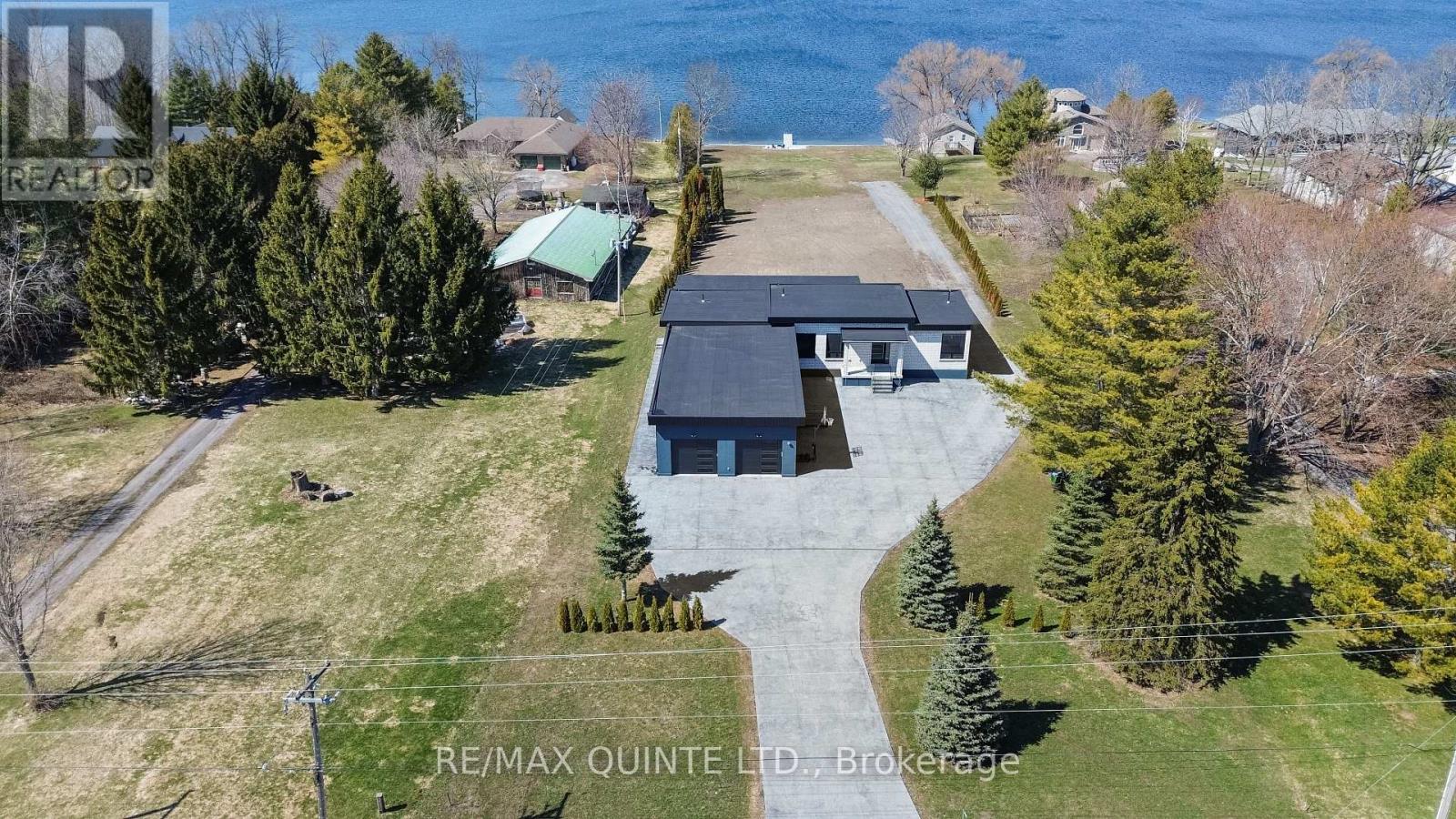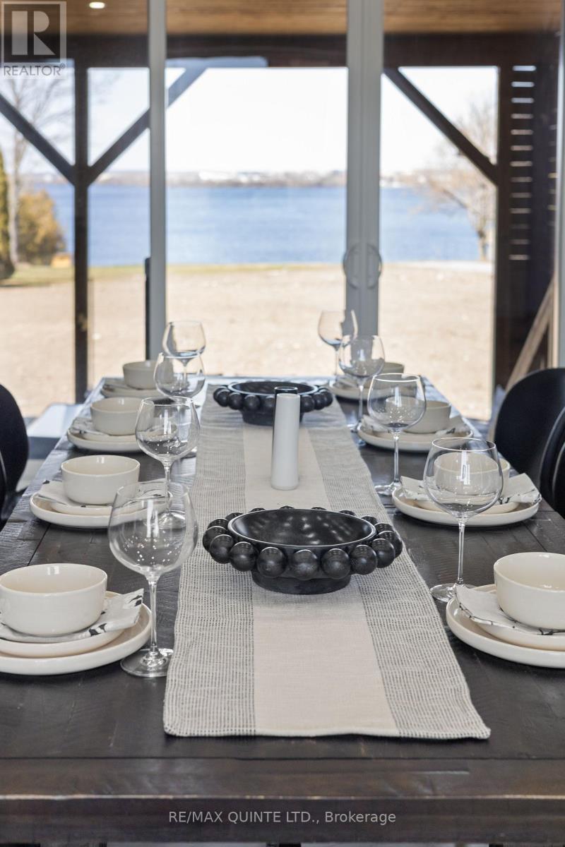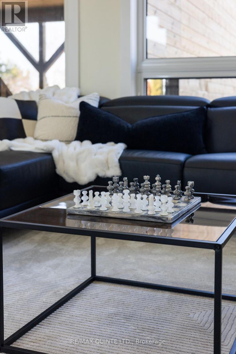Stunning modern waterfront home set on over 1.6 acres with approximately 150 feet of private shoreline on the Bay of Quinte, located along one of the most exclusive stretches in Prince Edward County. This newly constructed custom bungalow showcases a high level of construction throughout, featuring a striking stucco and brick exterior, stamped concrete driveway, patio, and walkways. Inside, the home offers 3+3 bedrooms and 3 bathrooms across two fully finished levels, with water views from nearly every room. The main living area features 12-foot ceilings, 10-foot ceilings in the bedrooms, oversized Alcabri windows, 8-foot doors, and custom cabinetry throughout, complimented by 9-inch engineered white oak flooring. The kitchen includes a 10 x 5 quartz waterfall island with hidden storage, dual sink, continuous quartz backsplash, and Caf appliances. The primary suite offers a 5-piece ensuite with double sinks, soaker tub, and glass walk-in shower, along with a 12-foot sliding door leading to a 55 x 21 covered patio. The lower level features 8-foot ceilings, a large rec room, gym area, powder room, laundry with quartz counters, and 3 additional bedrooms with oversized windows. Connected through a heated and cooled flex space is a 40.5 x 28.5 garage with 13-foot ceilings, pot lights, and 12-inch concrete flooring. The waterfront includes a 20-foot composite cantilever dock, armour stone shoreline, and firepit patio. The lot allows for a secondary dwelling. A well-executed waterfront home in Prince Edward County. (id:63658)