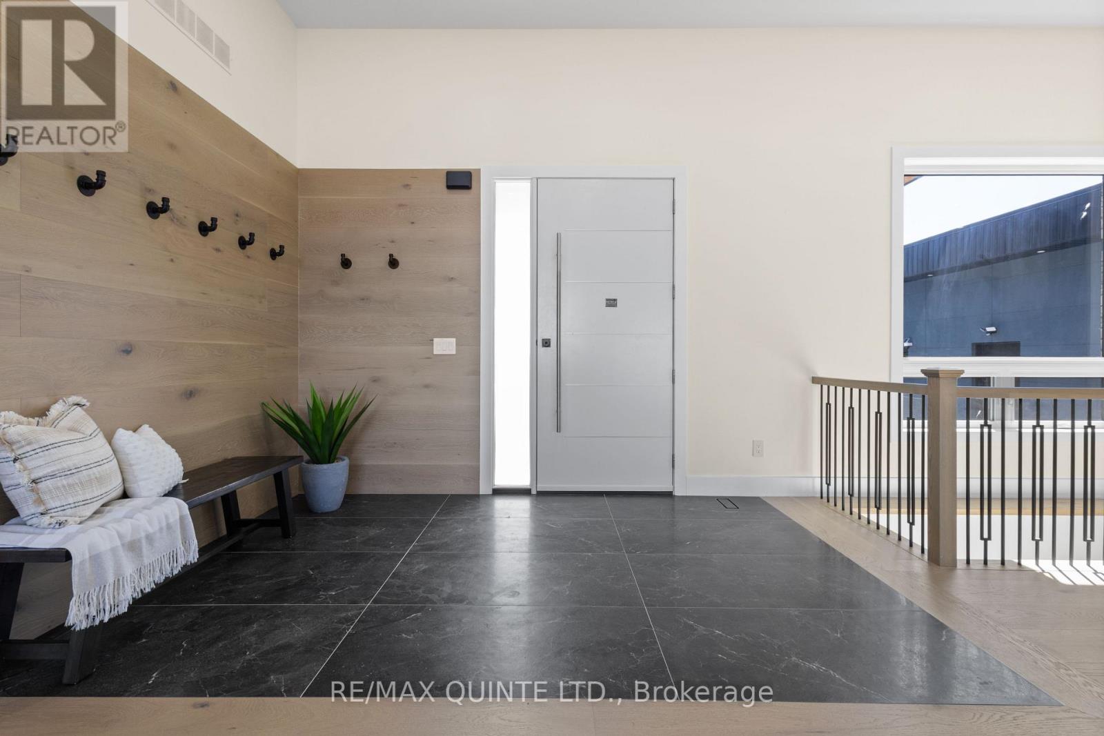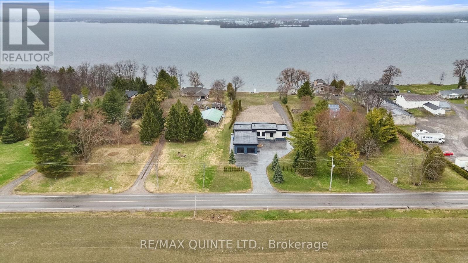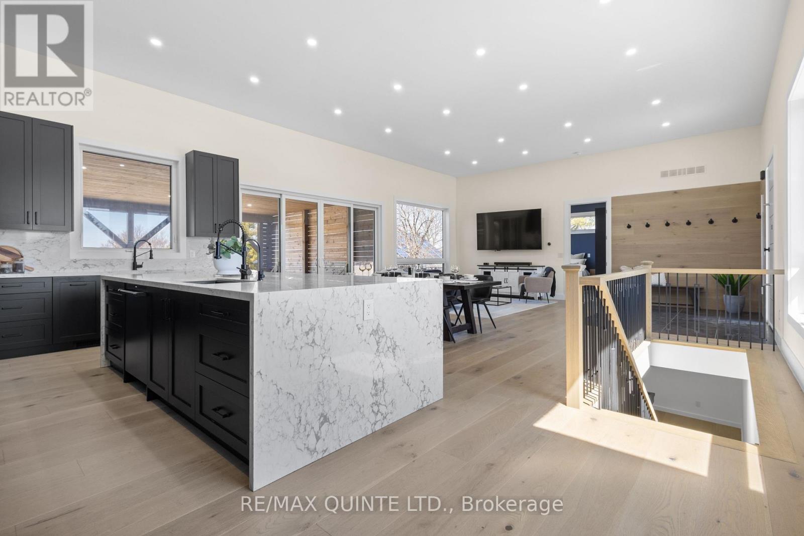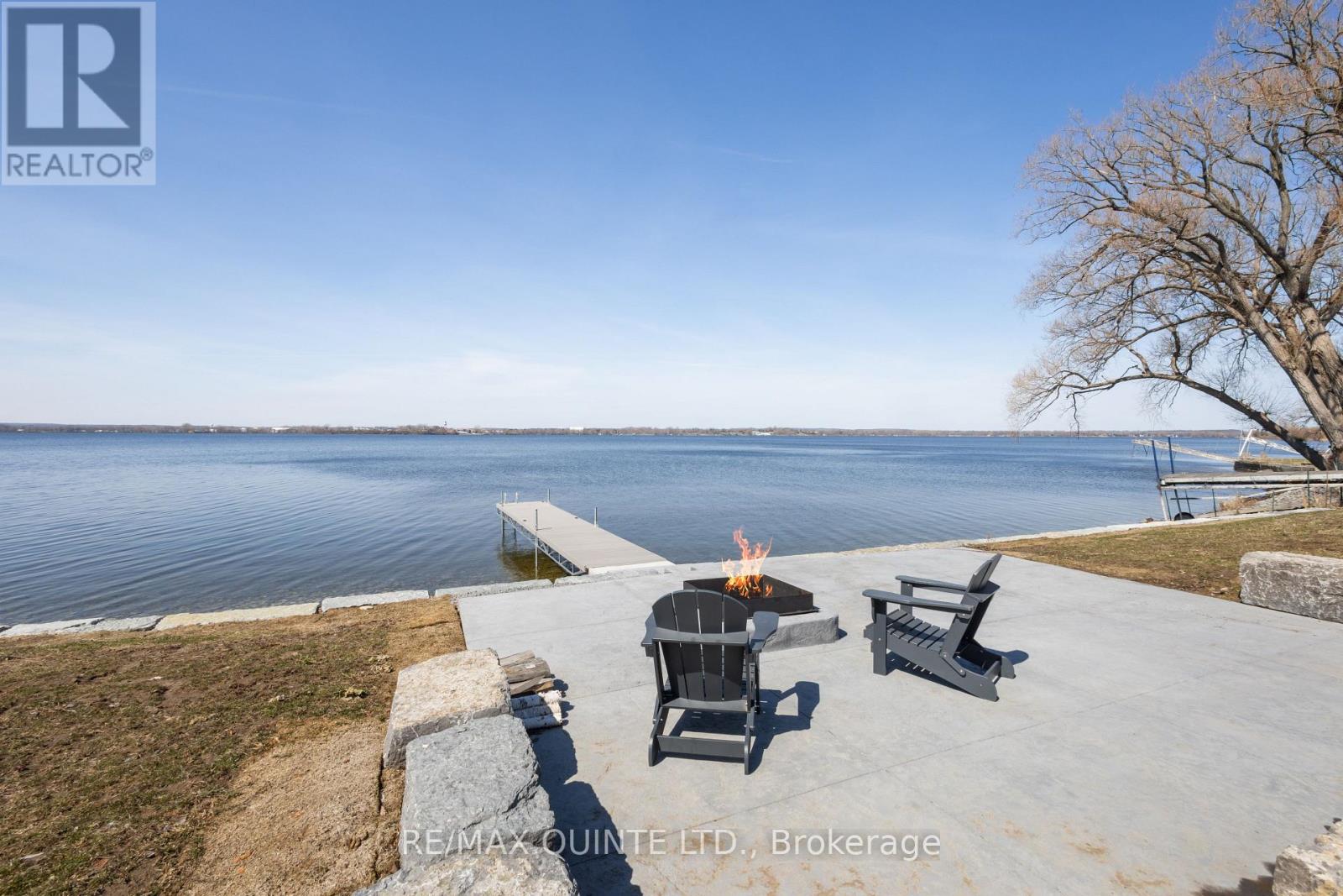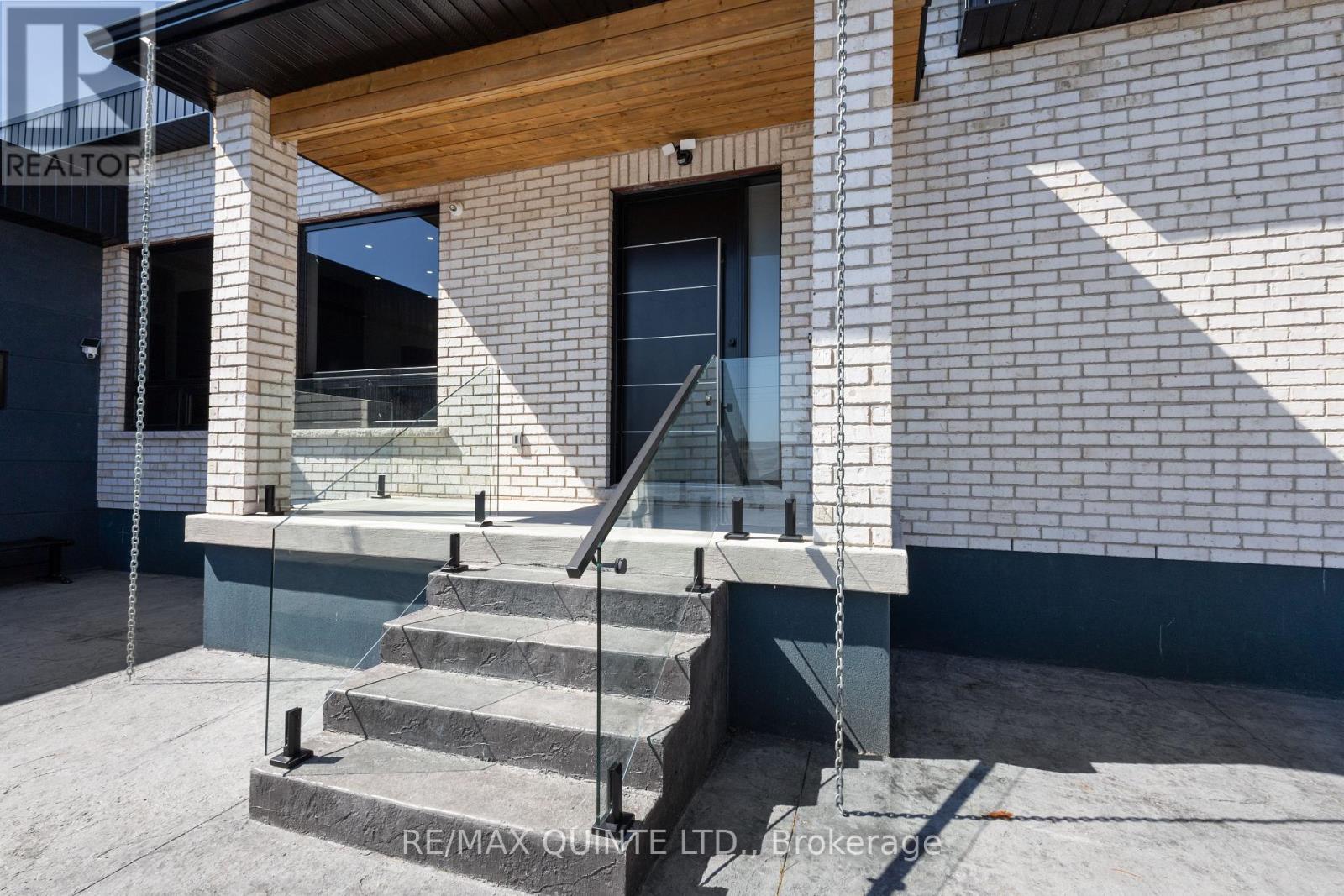 Stunning modern waterfront home set on over 1.6 acres with approximately 150 feet of private shoreline on the Bay of Quinte, located along one of the most exclusive stretches in Prince Edward County. This newly constructed custom bungalow showcases a high level of construction throughout, featuring a striking stucco and brick exterior, stamped concrete driveway, patio, and walkways. Inside, the home offers 3+3 bedrooms and 3 bathrooms across two fully finished levels, with water views from nearly every room. The main living area features 12-foot ceilings, 10-foot ceilings in the bedrooms, oversized Alcabri windows, 8-foot doors, and custom cabinetry throughout, complimented by 9-inch engineered white oak flooring. The kitchen includes a 10 x 5 quartz waterfall island with hidden storage, dual sink, continuous quartz backsplash, and Caf appliances. The primary suite offers a 5-piece ensuite with double sinks, soaker tub, and glass walk-in shower, along with a 12-foot sliding door leading to a 55 x 21 covered patio. The lower level features 8-foot ceilings, a large rec room, gym area, powder room, laundry with quartz counters, and 3 additional bedrooms with oversized windows. Connected through a heated and cooled flex space is a 40.5 x 28.5 garage with 13-foot ceilings, pot lights, and 12-inch concrete flooring. The waterfront includes a 20-foot composite cantilever dock, armour stone shoreline, and firepit patio. The lot allows for a secondary dwelling. A well-executed waterfront home in Prince Edward County. (id:63658)