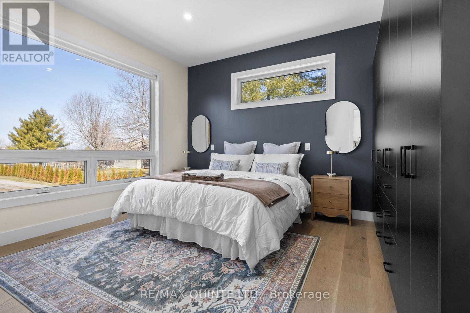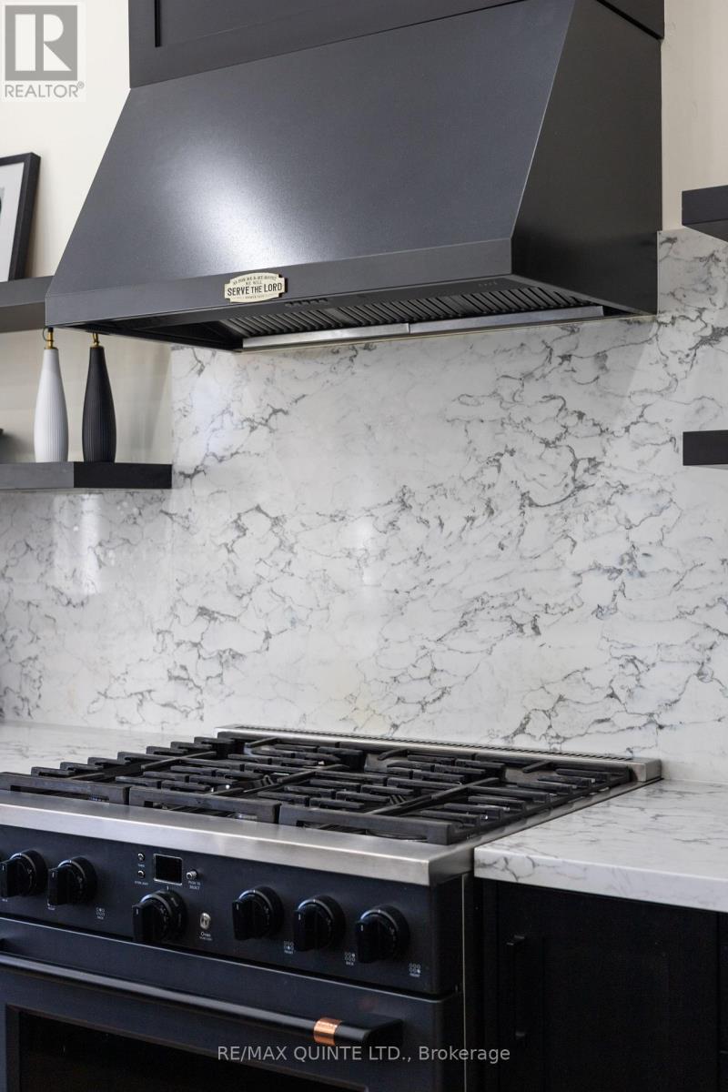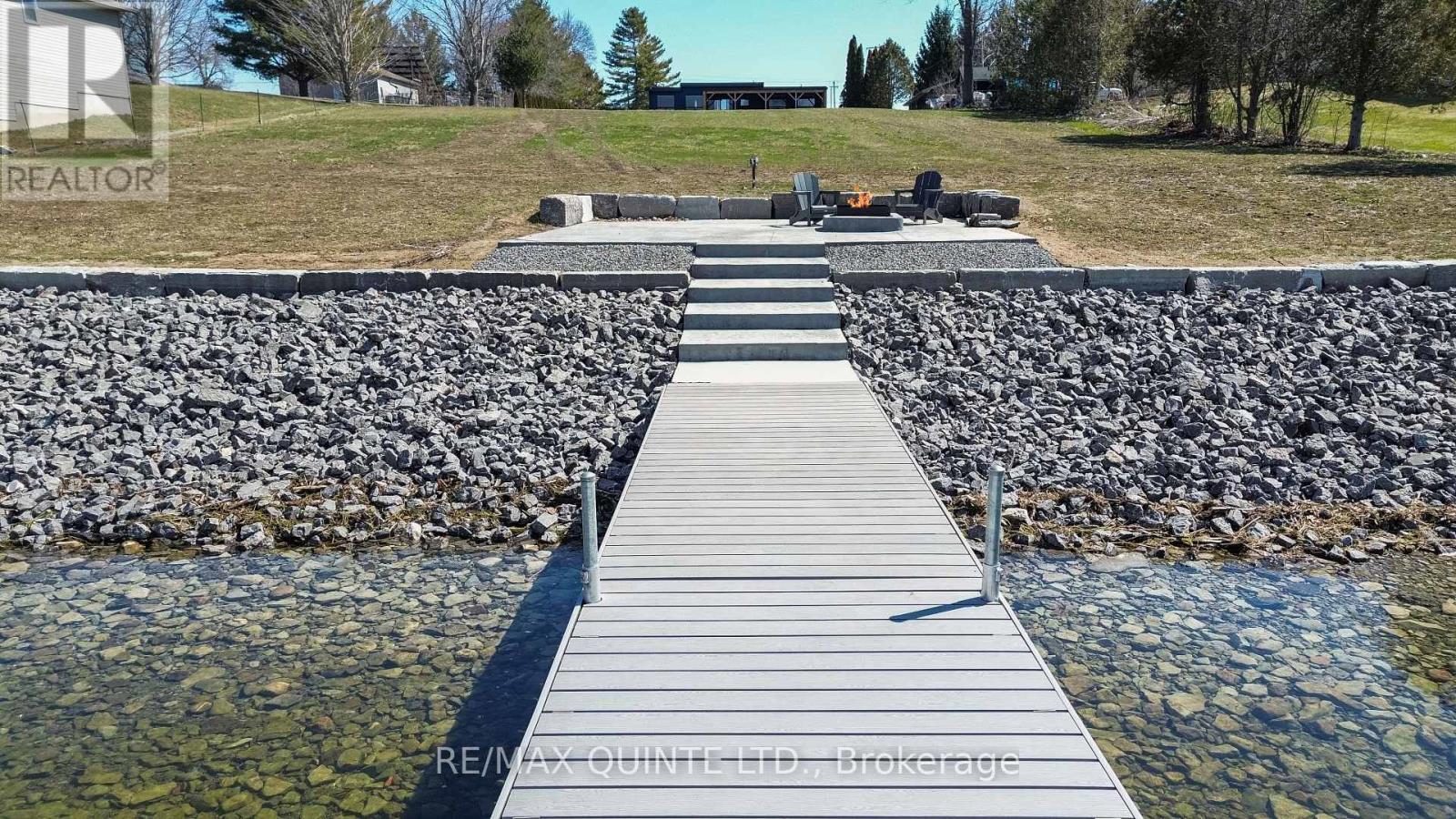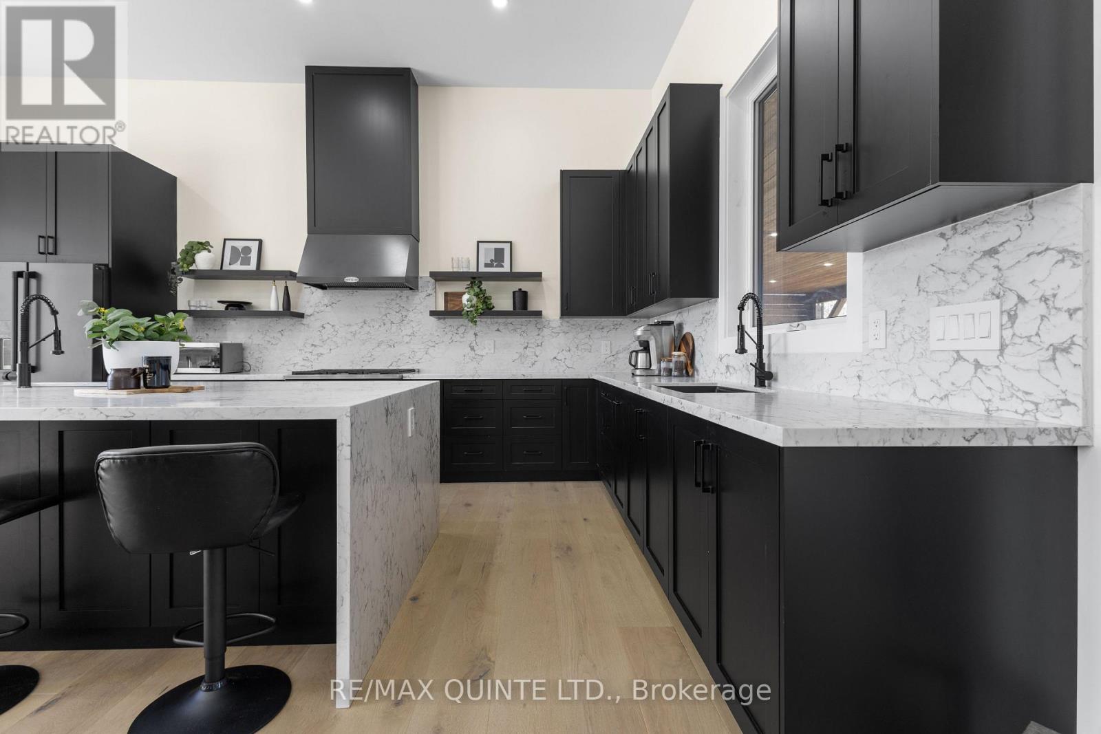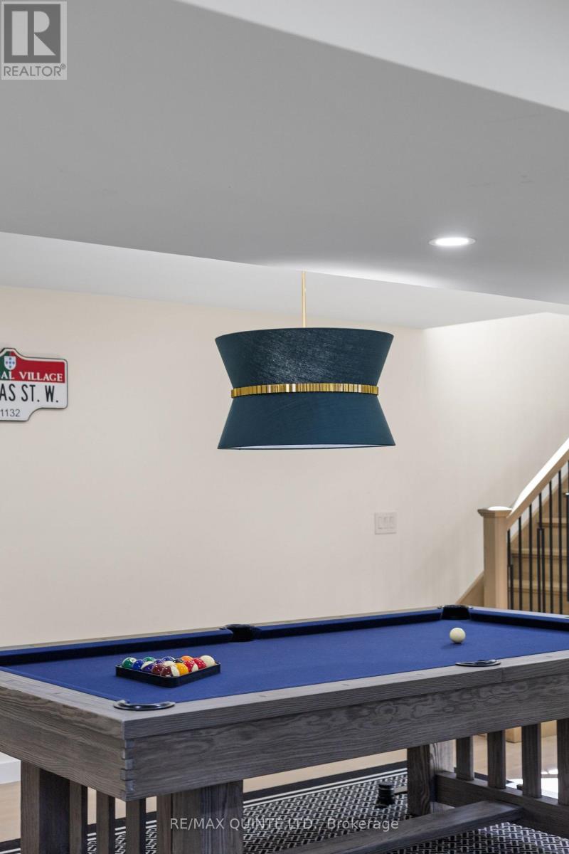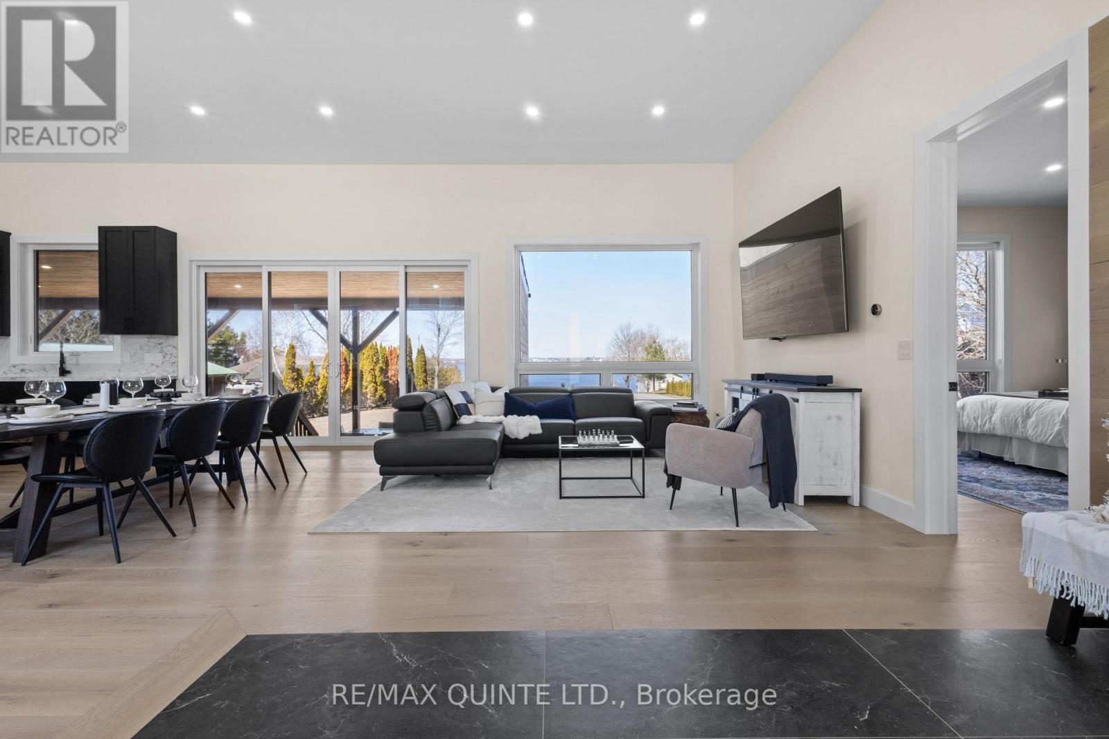 Stunning modern waterfront home set on over 1.6 acres with approximately 150 feet of private shoreline on the Bay of Quinte, located along one of the most exclusive stretches in Prince Edward County. This newly constructed custom bungalow showcases a high level of construction throughout, featuring a striking stucco and brick exterior, stamped concrete driveway, patio, and walkways. Inside, the home offers 3+3 bedrooms and 3 bathrooms across two fully finished levels, with water views from nearly every room. The main living area features 12-foot ceilings, 10-foot ceilings in the bedrooms, oversized Alcabri windows, 8-foot doors, and custom cabinetry throughout, complimented by 9-inch engineered white oak flooring. The kitchen includes a 10 x 5 quartz waterfall island with hidden storage, dual sink, continuous quartz backsplash, and Caf appliances. The primary suite offers a 5-piece ensuite with double sinks, soaker tub, and glass walk-in shower, along with a 12-foot sliding door leading to a 55 x 21 covered patio. The lower level features 8-foot ceilings, a large rec room, gym area, powder room, laundry with quartz counters, and 3 additional bedrooms with oversized windows. Connected through a heated and cooled flex space is a 40.5 x 28.5 garage with 13-foot ceilings, pot lights, and 12-inch concrete flooring. The waterfront includes a 20-foot composite cantilever dock, armour stone shoreline, and firepit patio. The lot allows for a secondary dwelling. A well-executed waterfront home in Prince Edward County. (id:63658)