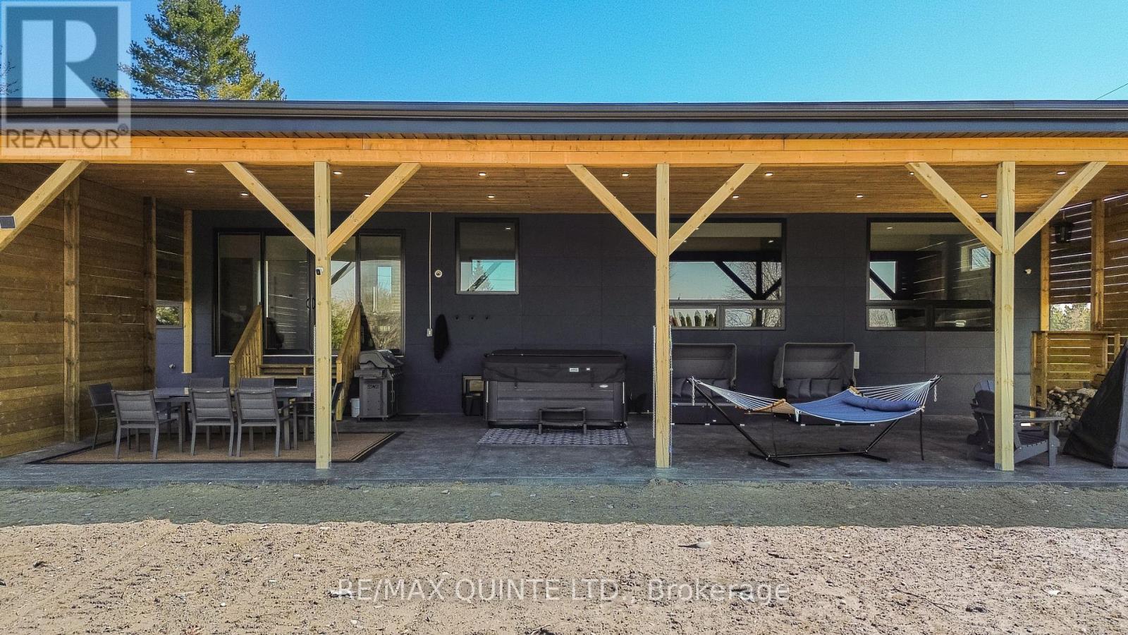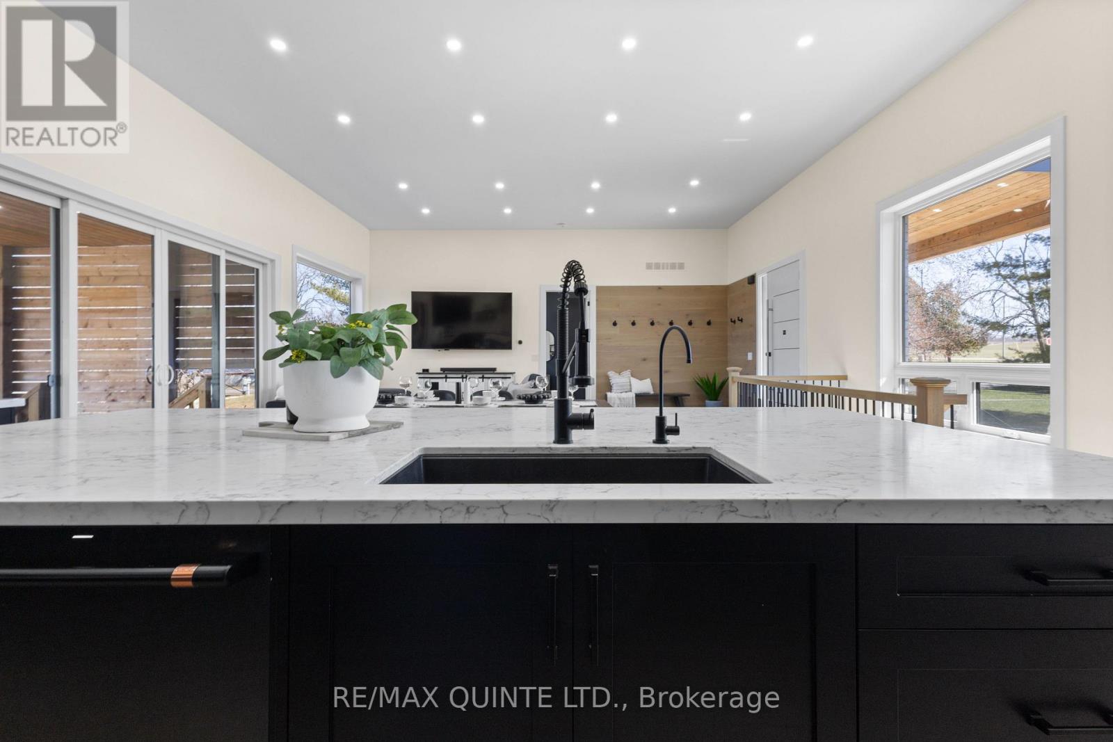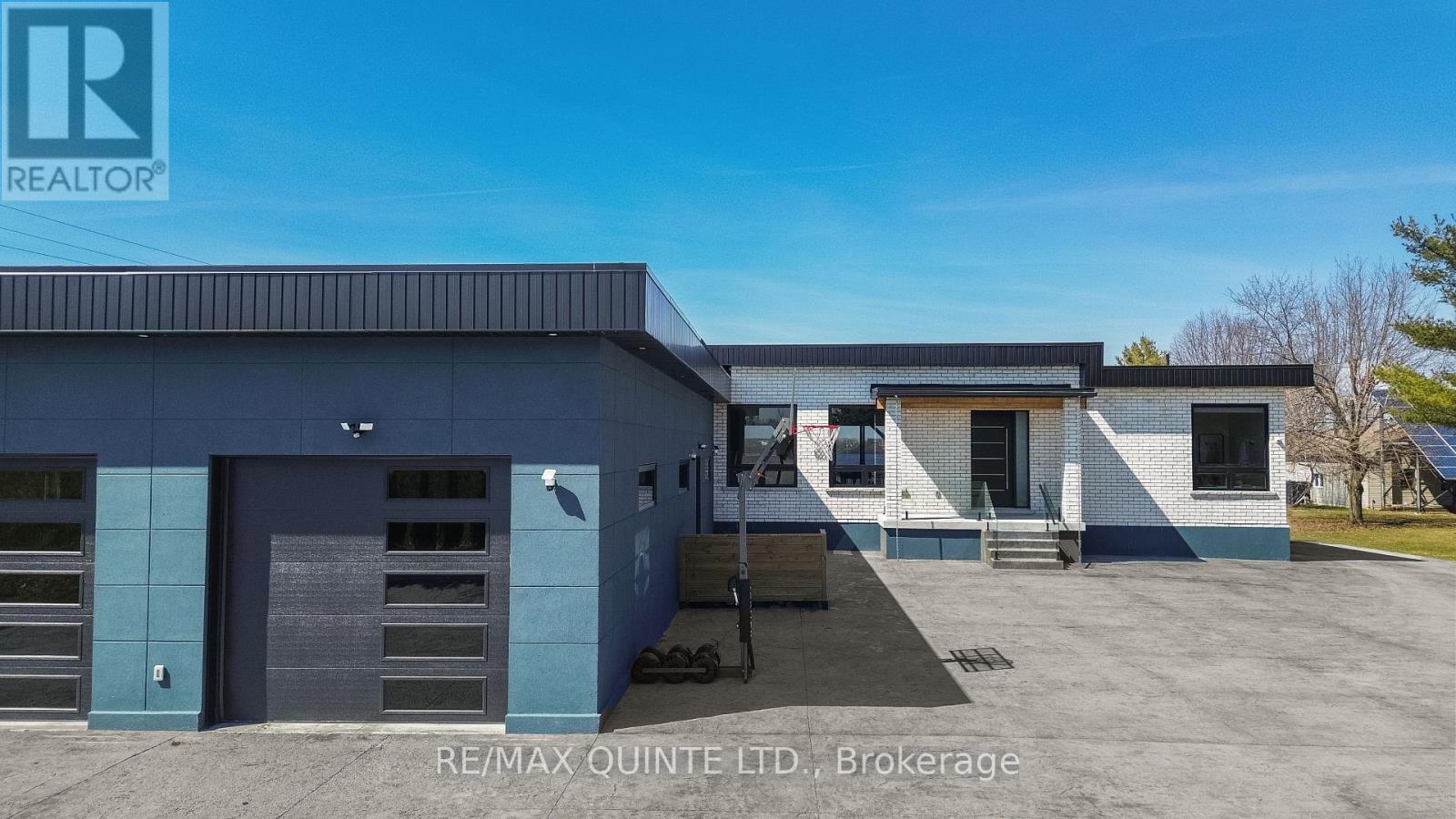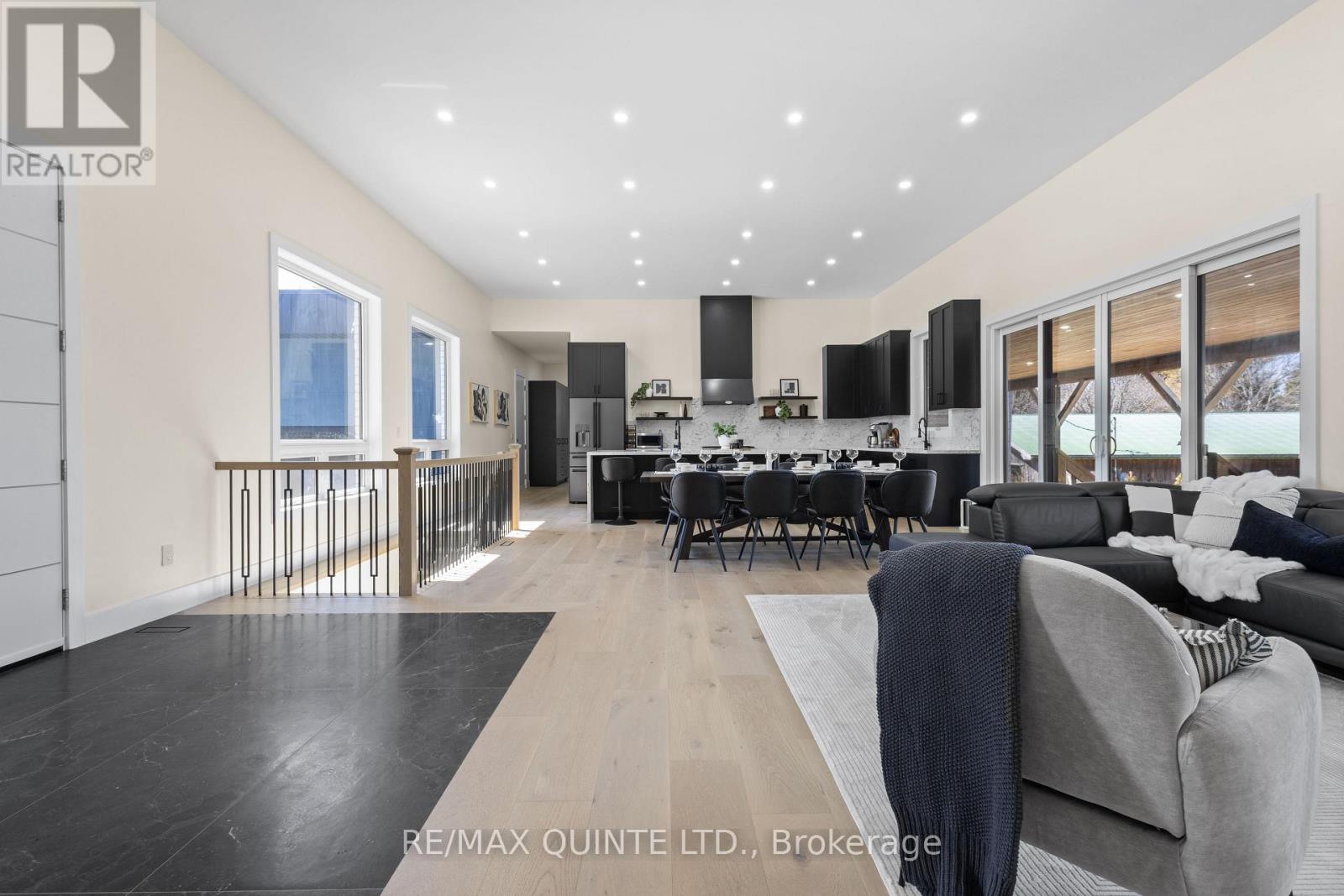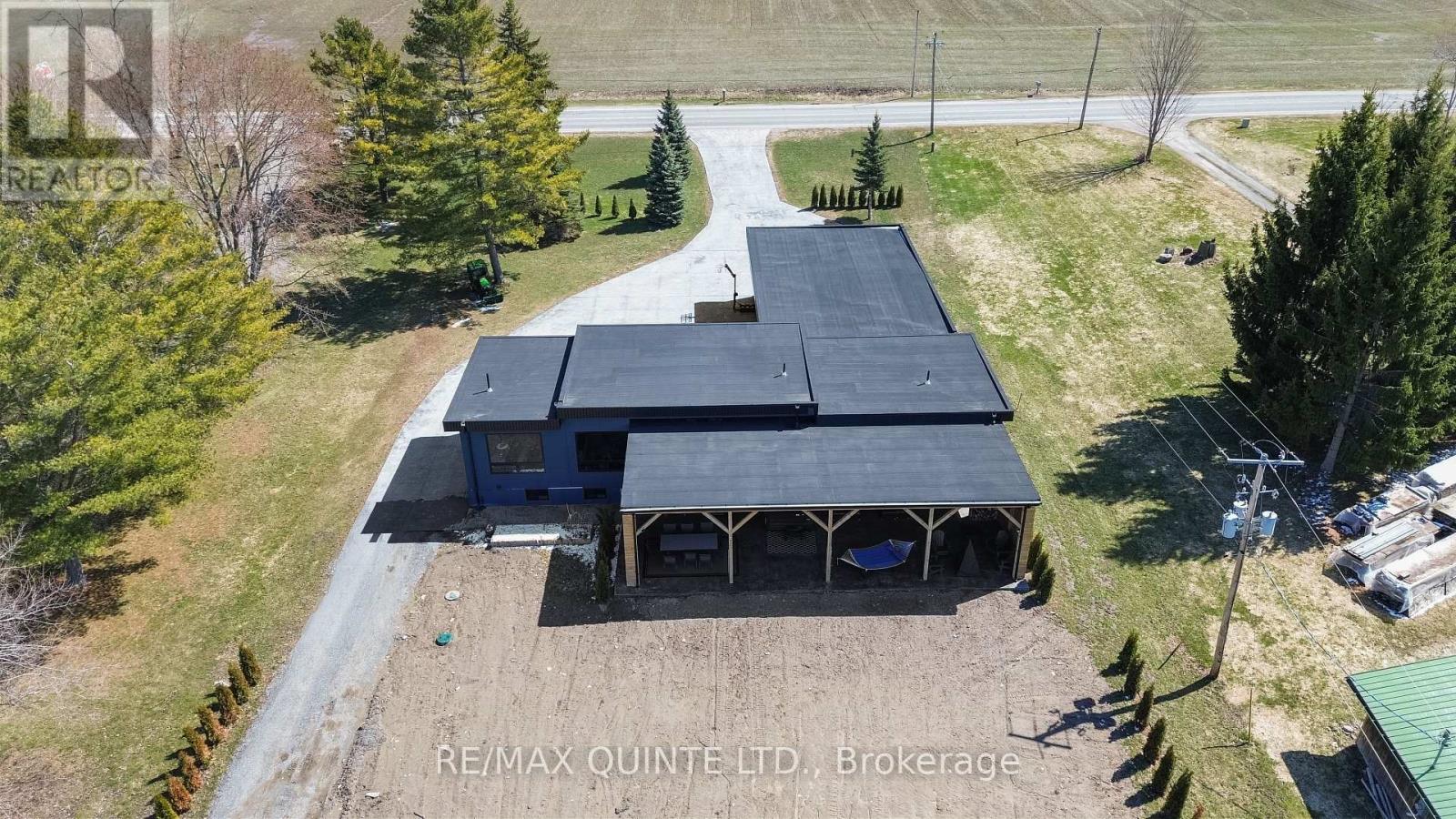 Stunning modern waterfront home set on over 1.6 acres with approximately 150 feet of private shoreline on the Bay of Quinte, located along one of the most exclusive stretches in Prince Edward County. This newly constructed custom bungalow showcases a high level of construction throughout, featuring a striking stucco and brick exterior, stamped concrete driveway, patio, and walkways. Inside, the home offers 3+3 bedrooms and 3 bathrooms across two fully finished levels, with water views from nearly every room. The main living area features 12-foot ceilings, 10-foot ceilings in the bedrooms, oversized Alcabri windows, 8-foot doors, and custom cabinetry throughout, complimented by 9-inch engineered white oak flooring. The kitchen includes a 10 x 5 quartz waterfall island with hidden storage, dual sink, continuous quartz backsplash, and Caf appliances. The primary suite offers a 5-piece ensuite with double sinks, soaker tub, and glass walk-in shower, along with a 12-foot sliding door leading to a 55 x 21 covered patio. The lower level features 8-foot ceilings, a large rec room, gym area, powder room, laundry with quartz counters, and 3 additional bedrooms with oversized windows. Connected through a heated and cooled flex space is a 40.5 x 28.5 garage with 13-foot ceilings, pot lights, and 12-inch concrete flooring. The waterfront includes a 20-foot composite cantilever dock, armour stone shoreline, and firepit patio. The lot allows for a secondary dwelling. A well-executed waterfront home in Prince Edward County. (id:63658)