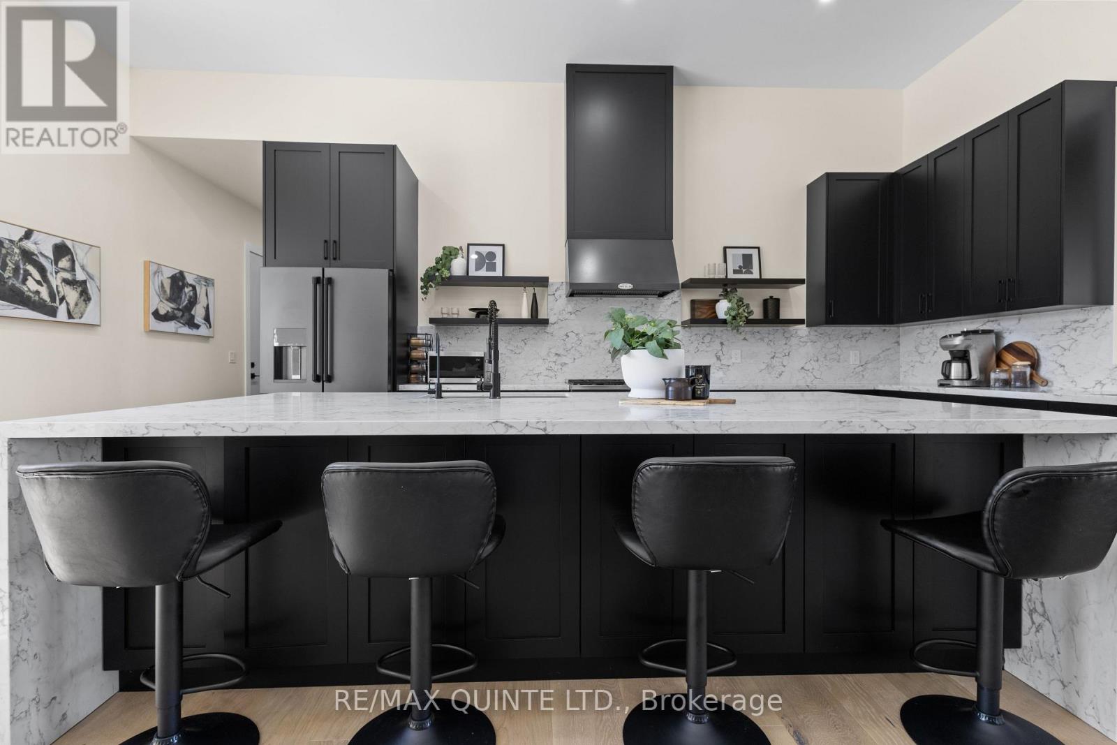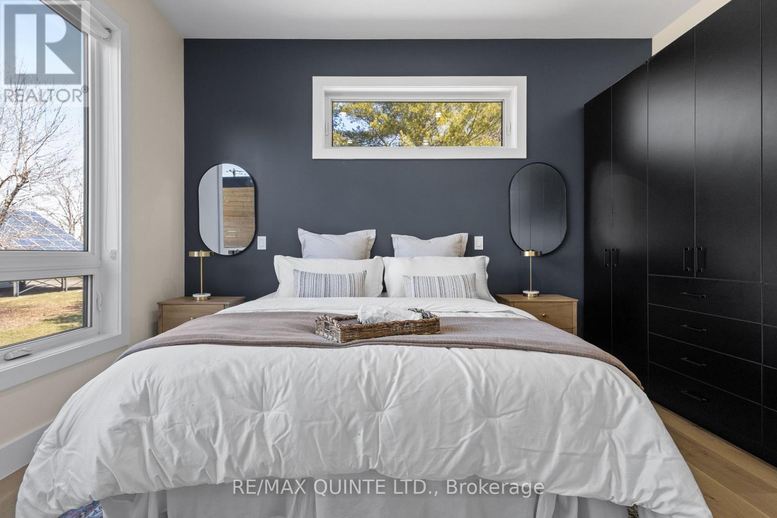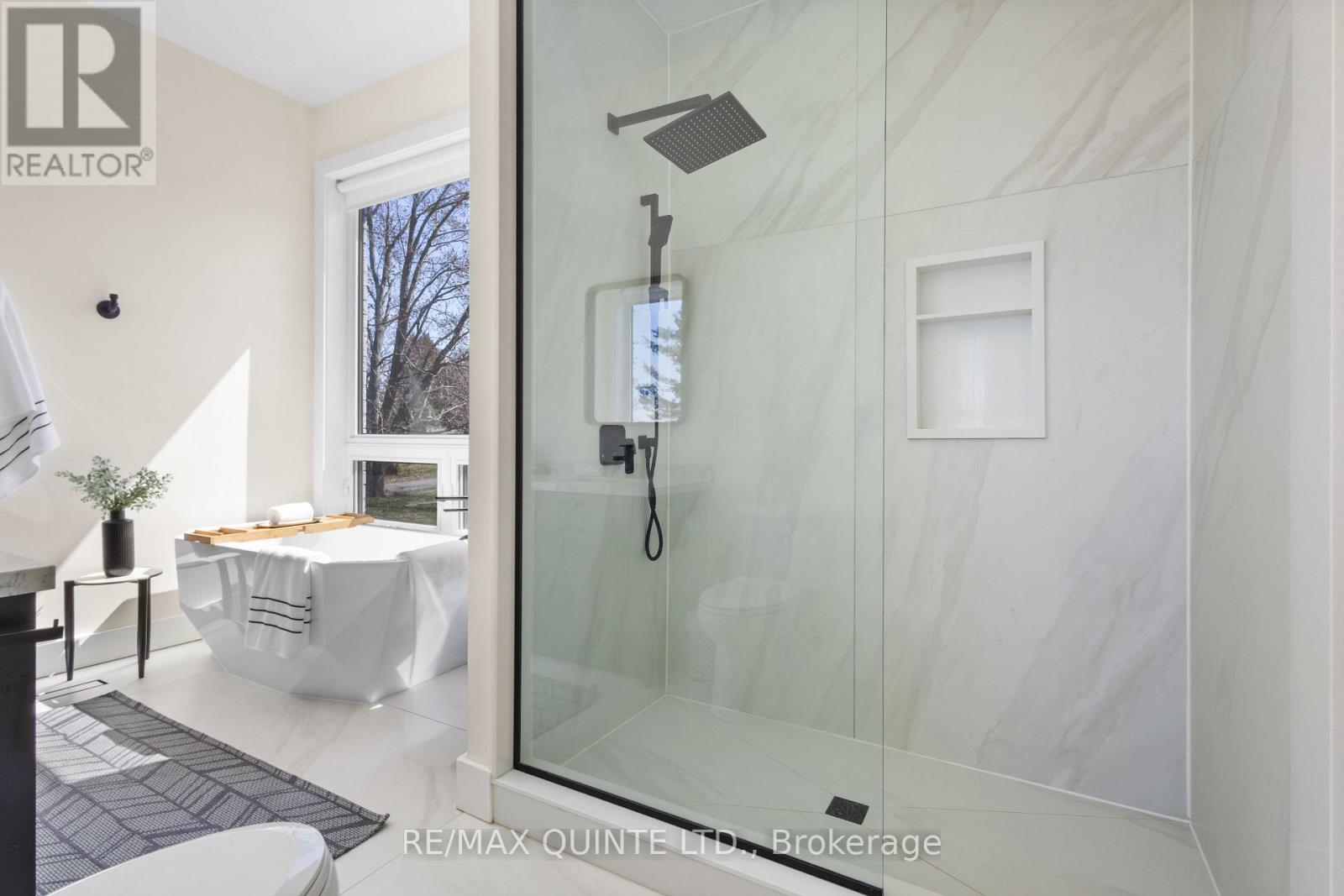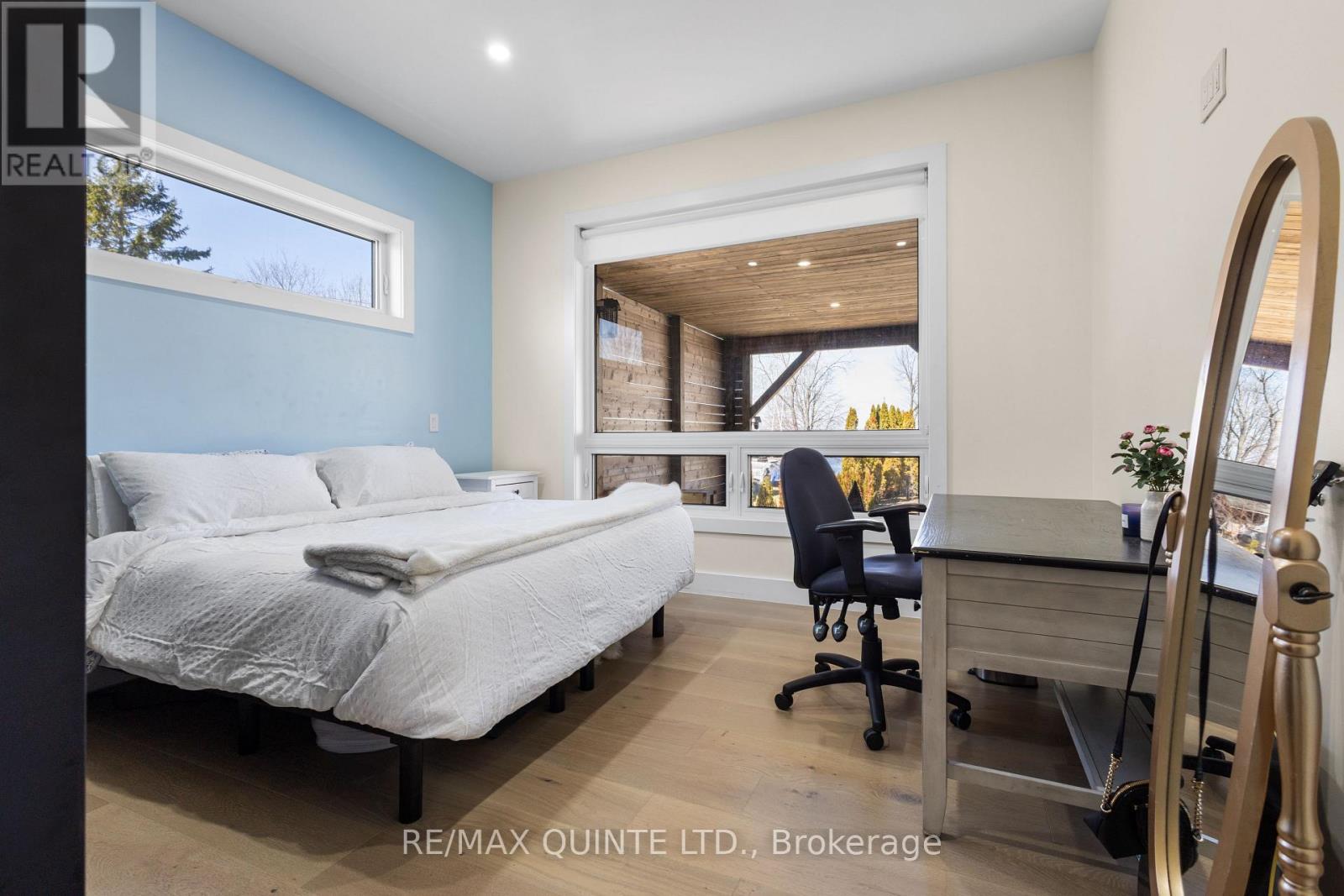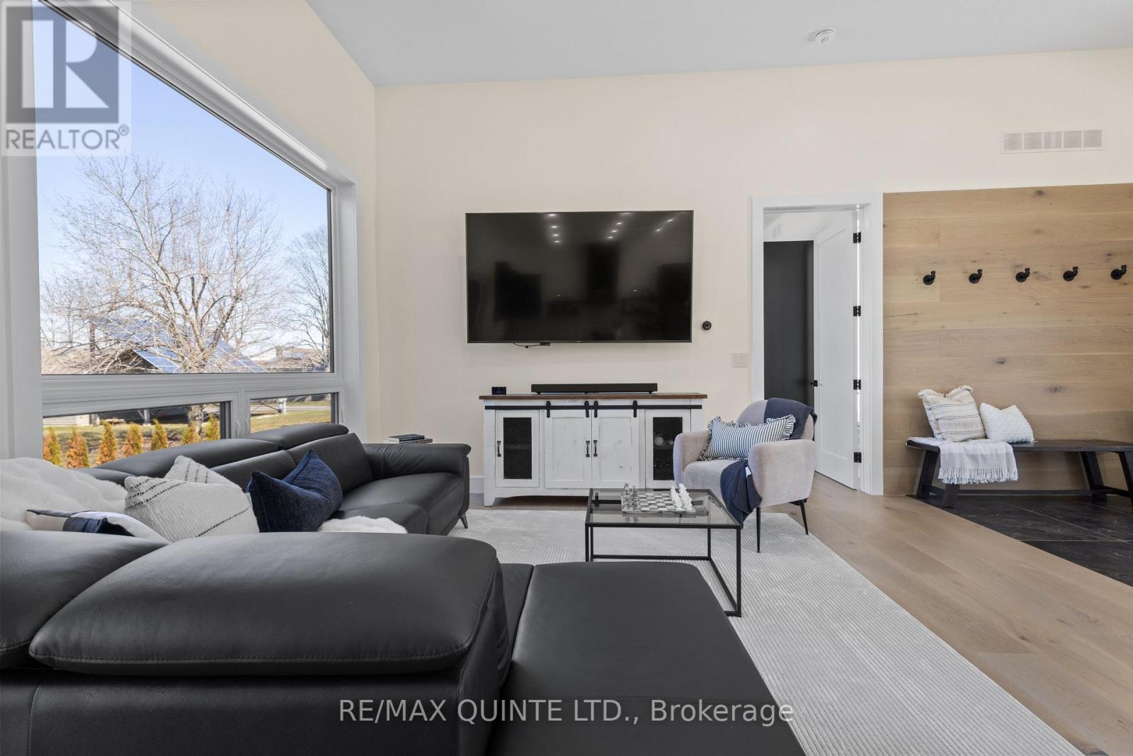 Stunning modern waterfront home set on over 1.6 acres with approximately 150 feet of private shoreline on the Bay of Quinte, located along one of the most exclusive stretches in Prince Edward County. This newly constructed custom bungalow showcases a high level of construction throughout, featuring a striking stucco and brick exterior, stamped concrete driveway, patio, and walkways. Inside, the home offers 3+3 bedrooms and 3 bathrooms across two fully finished levels, with water views from nearly every room. The main living area features 12-foot ceilings, 10-foot ceilings in the bedrooms, oversized Alcabri windows, 8-foot doors, and custom cabinetry throughout, complimented by 9-inch engineered white oak flooring. The kitchen includes a 10 x 5 quartz waterfall island with hidden storage, dual sink, continuous quartz backsplash, and Caf appliances. The primary suite offers a 5-piece ensuite with double sinks, soaker tub, and glass walk-in shower, along with a 12-foot sliding door leading to a 55 x 21 covered patio. The lower level features 8-foot ceilings, a large rec room, gym area, powder room, laundry with quartz counters, and 3 additional bedrooms with oversized windows. Connected through a heated and cooled flex space is a 40.5 x 28.5 garage with 13-foot ceilings, pot lights, and 12-inch concrete flooring. The waterfront includes a 20-foot composite cantilever dock, armour stone shoreline, and firepit patio. The lot allows for a secondary dwelling. A well-executed waterfront home in Prince Edward County. (id:63658)
