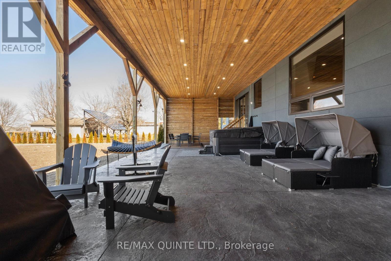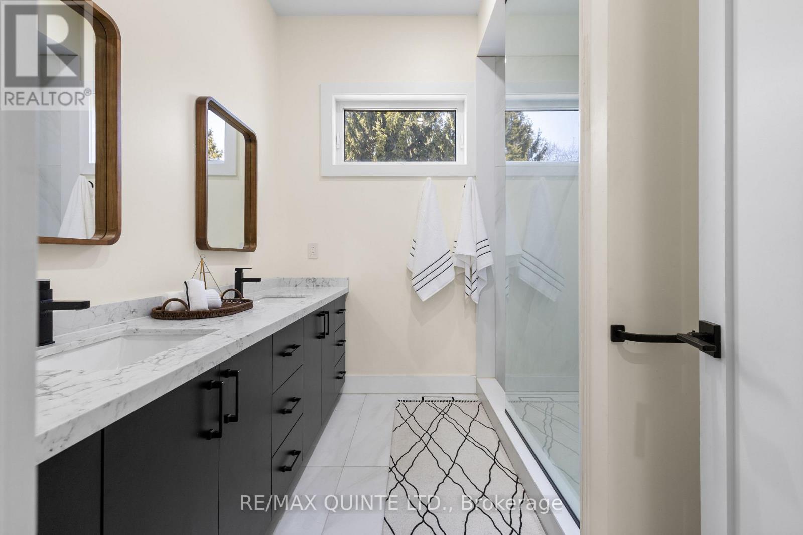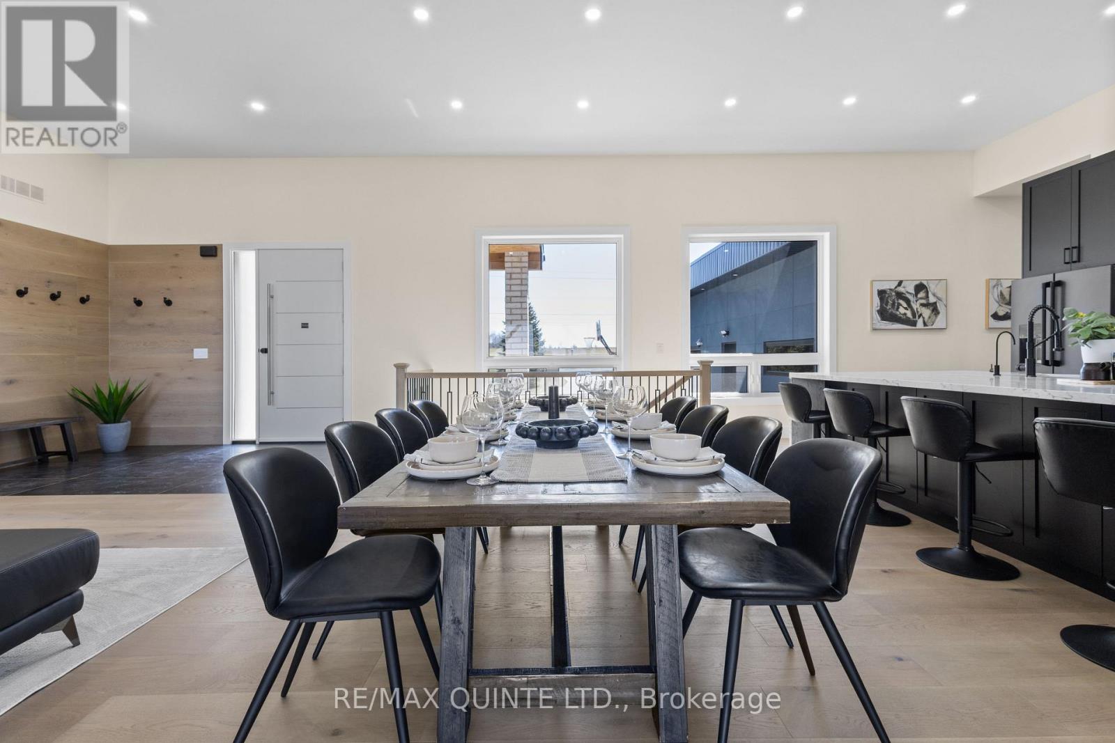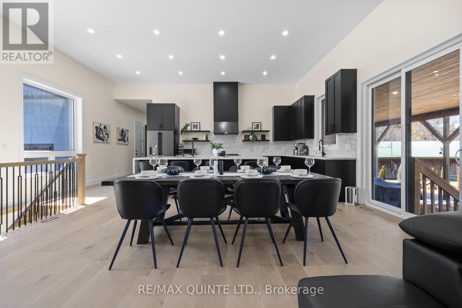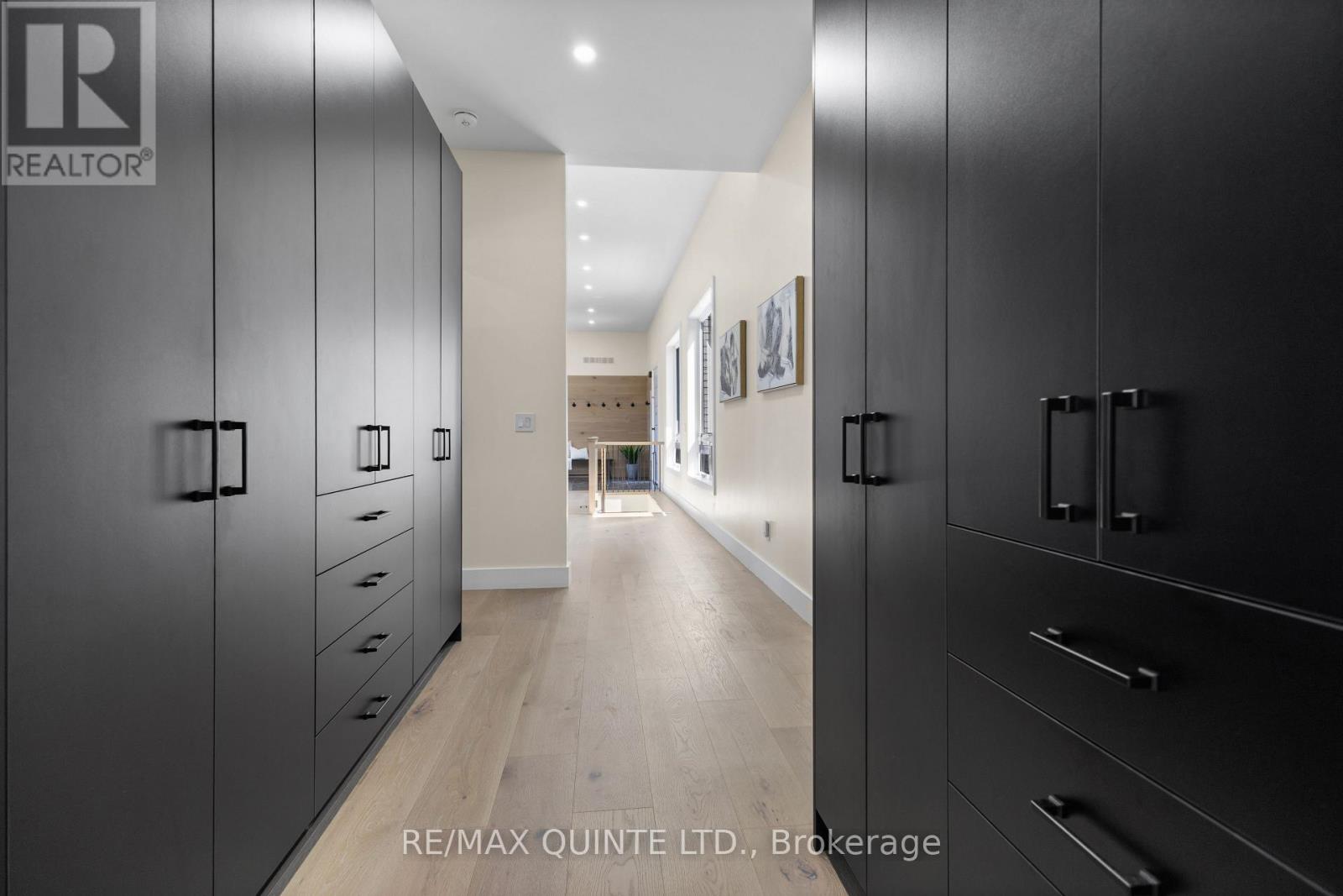 Stunning modern waterfront home set on over 1.6 acres with approximately 150 feet of private shoreline on the Bay of Quinte, located along one of the most exclusive stretches in Prince Edward County. This newly constructed custom bungalow showcases a high level of construction throughout, featuring a striking stucco and brick exterior, stamped concrete driveway, patio, and walkways. Inside, the home offers 3+3 bedrooms and 3 bathrooms across two fully finished levels, with water views from nearly every room. The main living area features 12-foot ceilings, 10-foot ceilings in the bedrooms, oversized Alcabri windows, 8-foot doors, and custom cabinetry throughout, complimented by 9-inch engineered white oak flooring. The kitchen includes a 10 x 5 quartz waterfall island with hidden storage, dual sink, continuous quartz backsplash, and Caf appliances. The primary suite offers a 5-piece ensuite with double sinks, soaker tub, and glass walk-in shower, along with a 12-foot sliding door leading to a 55 x 21 covered patio. The lower level features 8-foot ceilings, a large rec room, gym area, powder room, laundry with quartz counters, and 3 additional bedrooms with oversized windows. Connected through a heated and cooled flex space is a 40.5 x 28.5 garage with 13-foot ceilings, pot lights, and 12-inch concrete flooring. The waterfront includes a 20-foot composite cantilever dock, armour stone shoreline, and firepit patio. The lot allows for a secondary dwelling. A well-executed waterfront home in Prince Edward County. (id:63658)