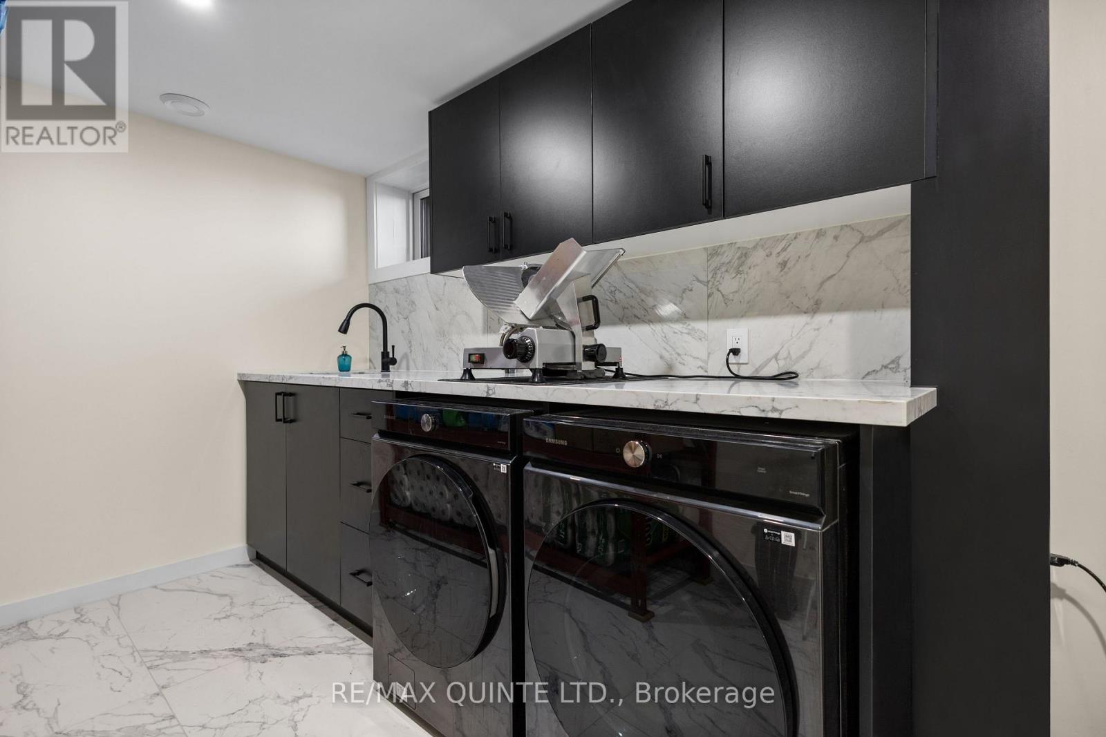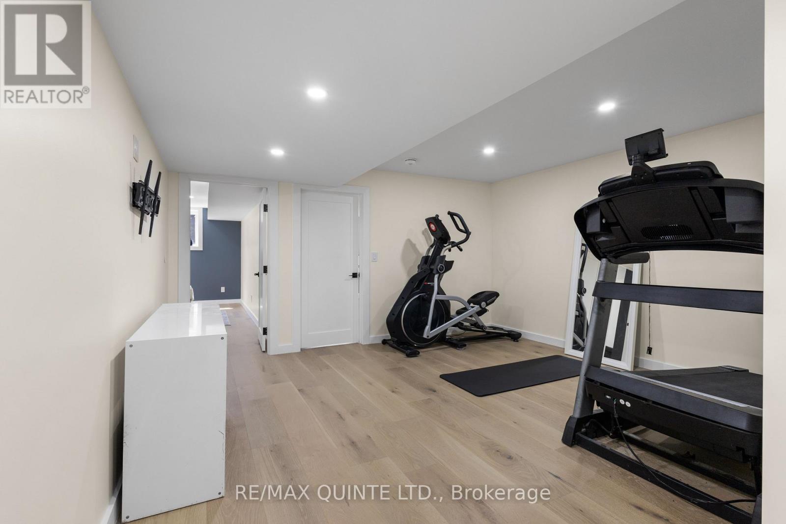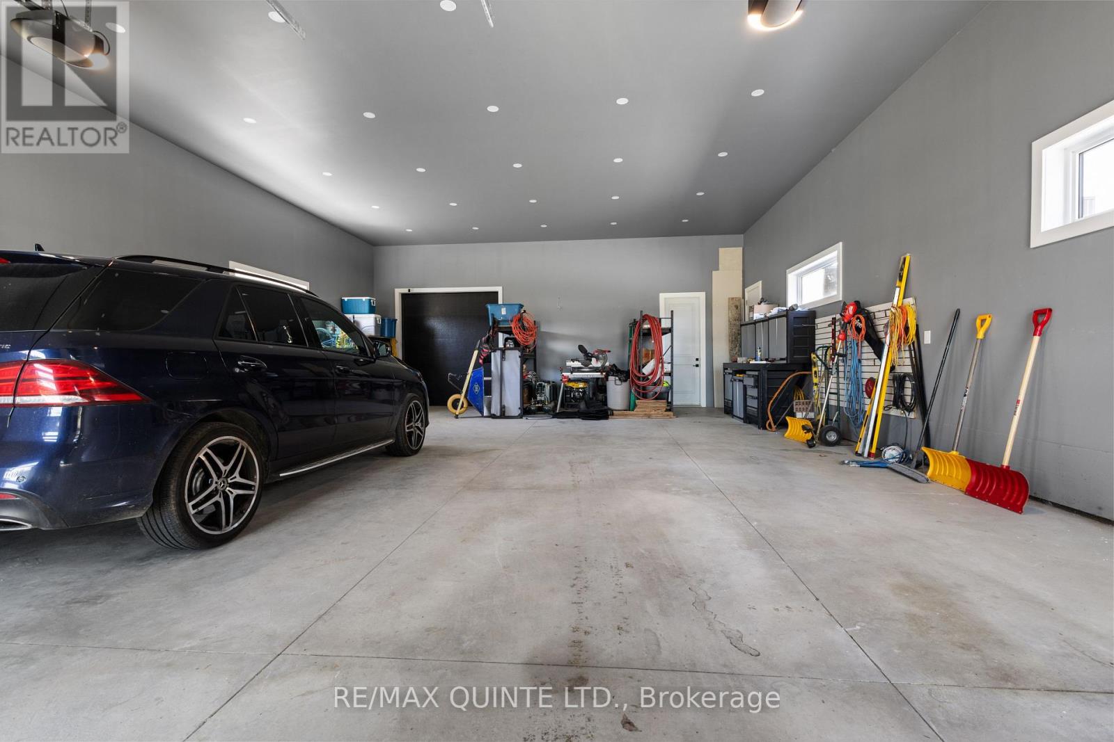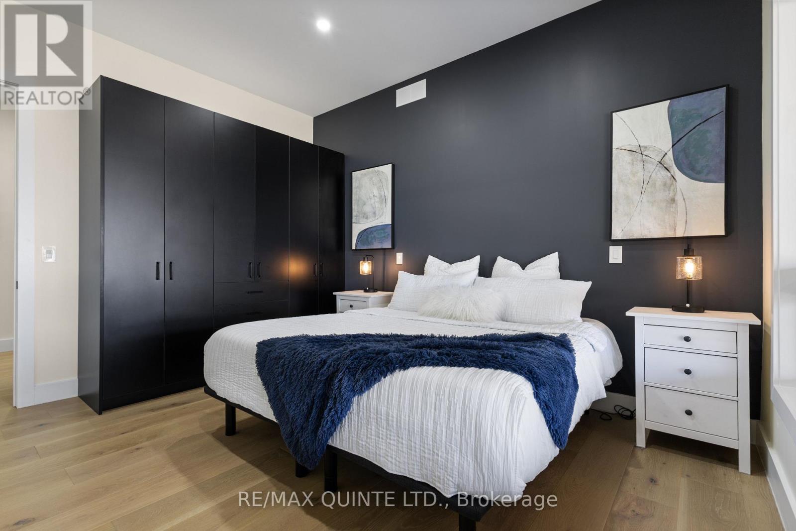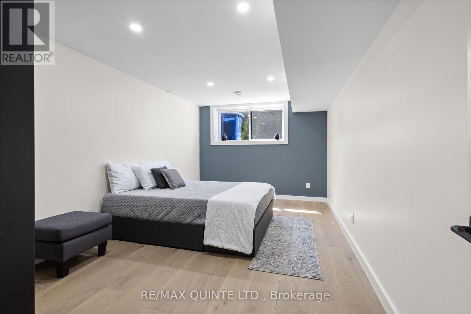 Stunning modern waterfront home set on over 1.6 acres with approximately 150 feet of private shoreline on the Bay of Quinte, located along one of the most exclusive stretches in Prince Edward County. This newly constructed custom bungalow showcases a high level of construction throughout, featuring a striking stucco and brick exterior, stamped concrete driveway, patio, and walkways. Inside, the home offers 3+3 bedrooms and 3 bathrooms across two fully finished levels, with water views from nearly every room. The main living area features 12-foot ceilings, 10-foot ceilings in the bedrooms, oversized Alcabri windows, 8-foot doors, and custom cabinetry throughout, complimented by 9-inch engineered white oak flooring. The kitchen includes a 10 x 5 quartz waterfall island with hidden storage, dual sink, continuous quartz backsplash, and Caf appliances. The primary suite offers a 5-piece ensuite with double sinks, soaker tub, and glass walk-in shower, along with a 12-foot sliding door leading to a 55 x 21 covered patio. The lower level features 8-foot ceilings, a large rec room, gym area, powder room, laundry with quartz counters, and 3 additional bedrooms with oversized windows. Connected through a heated and cooled flex space is a 40.5 x 28.5 garage with 13-foot ceilings, pot lights, and 12-inch concrete flooring. The waterfront includes a 20-foot composite cantilever dock, armour stone shoreline, and firepit patio. The lot allows for a secondary dwelling. A well-executed waterfront home in Prince Edward County. (id:63658)