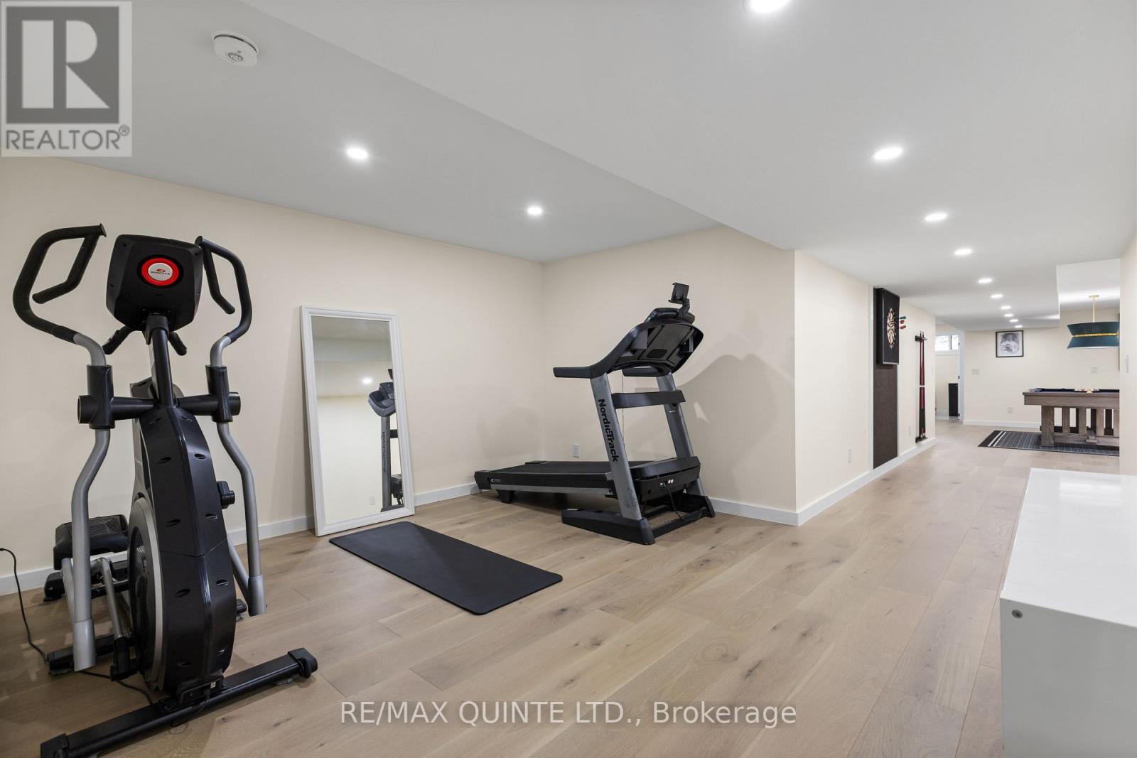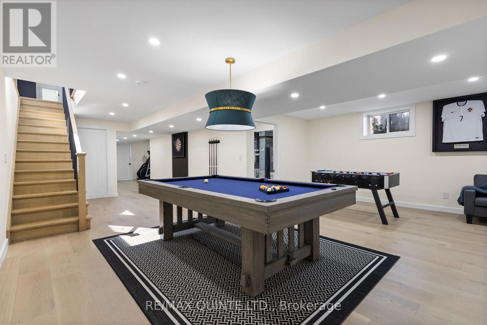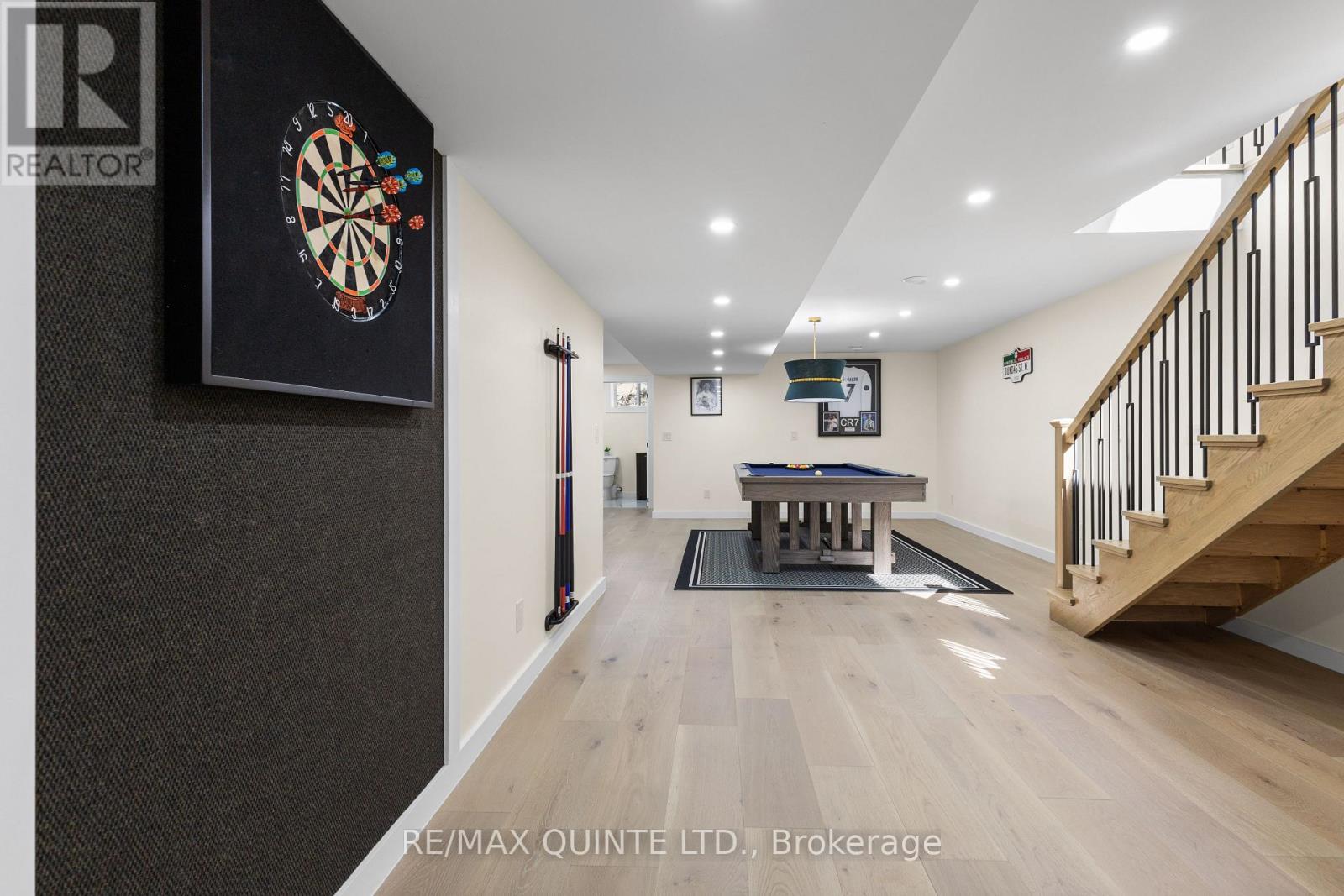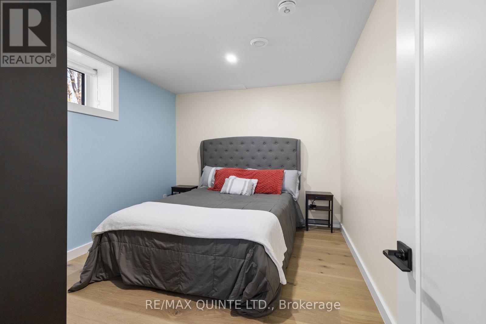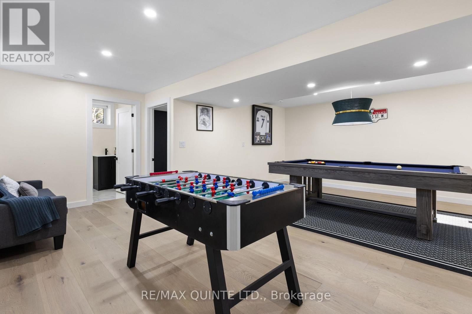 Stunning modern waterfront home set on over 1.6 acres with approximately 150 feet of private shoreline on the Bay of Quinte, located along one of the most exclusive stretches in Prince Edward County. This newly constructed custom bungalow showcases a high level of construction throughout, featuring a striking stucco and brick exterior, stamped concrete driveway, patio, and walkways. Inside, the home offers 3+3 bedrooms and 3 bathrooms across two fully finished levels, with water views from nearly every room. The main living area features 12-foot ceilings, 10-foot ceilings in the bedrooms, oversized Alcabri windows, 8-foot doors, and custom cabinetry throughout, complimented by 9-inch engineered white oak flooring. The kitchen includes a 10 x 5 quartz waterfall island with hidden storage, dual sink, continuous quartz backsplash, and Caf appliances. The primary suite offers a 5-piece ensuite with double sinks, soaker tub, and glass walk-in shower, along with a 12-foot sliding door leading to a 55 x 21 covered patio. The lower level features 8-foot ceilings, a large rec room, gym area, powder room, laundry with quartz counters, and 3 additional bedrooms with oversized windows. Connected through a heated and cooled flex space is a 40.5 x 28.5 garage with 13-foot ceilings, pot lights, and 12-inch concrete flooring. The waterfront includes a 20-foot composite cantilever dock, armour stone shoreline, and firepit patio. The lot allows for a secondary dwelling. A well-executed waterfront home in Prince Edward County. (id:63658)